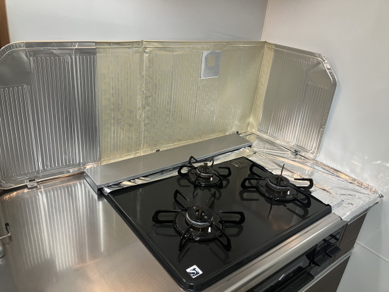 ガスコンロの油汚れは気合で取り除き、キッチンのステンレス部分はメラニンスポンジと、バイク用のサビ取り艶剤で磨き。
