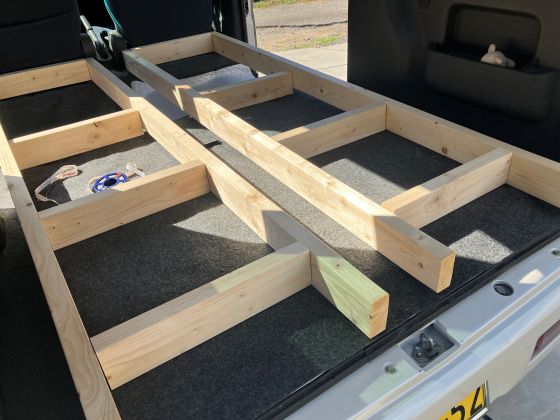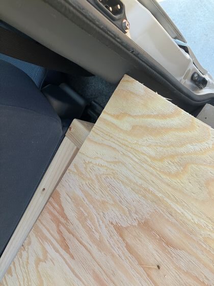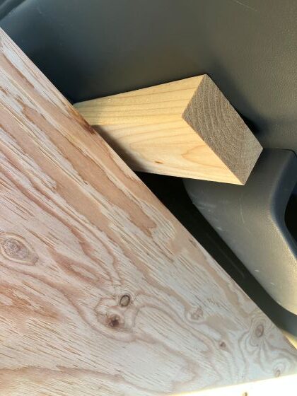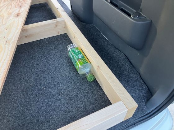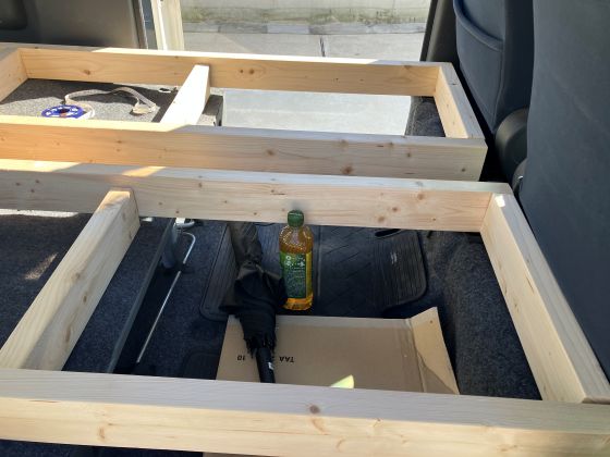 後部座席のあったところ周辺が浮いていますが、2*4を縦向きに置くので、よほどしなりません。この辺は私もやるまえは、「どうやって隙間を埋めようかな~」「後部座席の足置き部分にどうやって柱を建てようかな~」と考えていましたが、前席のレール部分に載せるだけで、全く強度的には問題ないと感じます。