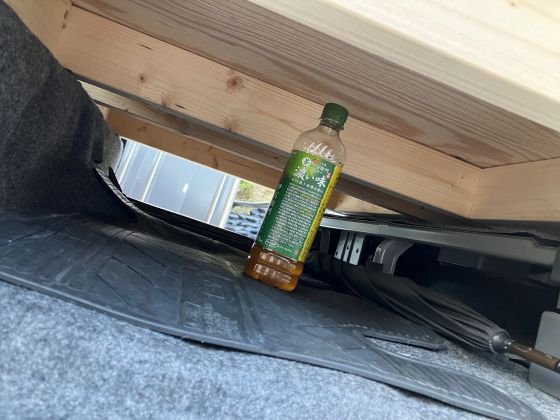 べニア合板を182*550(660)と長方形で切っていますので、タイヤハウスや、小物入れところに隙間ができます。ここを市販のキャンピングカーや車泊キットのような感じでキレイに型を取って切断するのは、DIY心をくすぐるのですが、多分失敗して余計気になるので、潔く長方形のままですね。