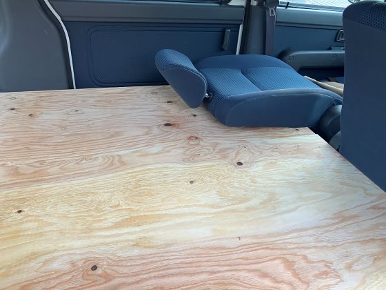 実際に合板の上で寝てみると、182cmだとやはり少々狭い。助手席を倒すことができるので、ソロキャンプなら、この助手席を倒した高さに合わせたベット(収納を兼ねた)を作るのもありかな~と思います。