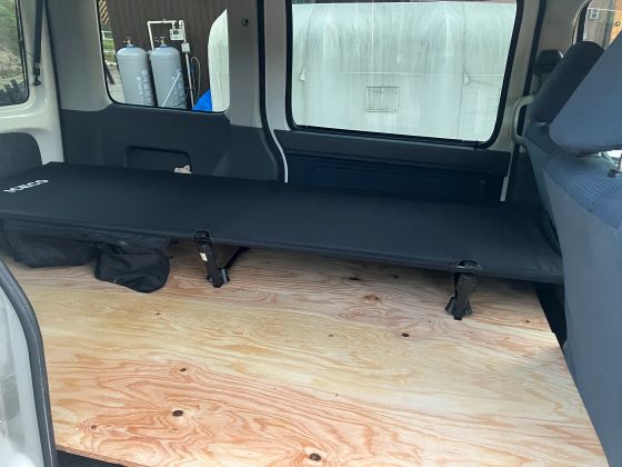 助手席を限界まで前に出せば、かなりギリギリ(というか無理ヤリ)ですが、コットが置けました。寝るときは助手席を前側に倒せば、ある程度足を延ばせるスペース(少しですが)ができます。
