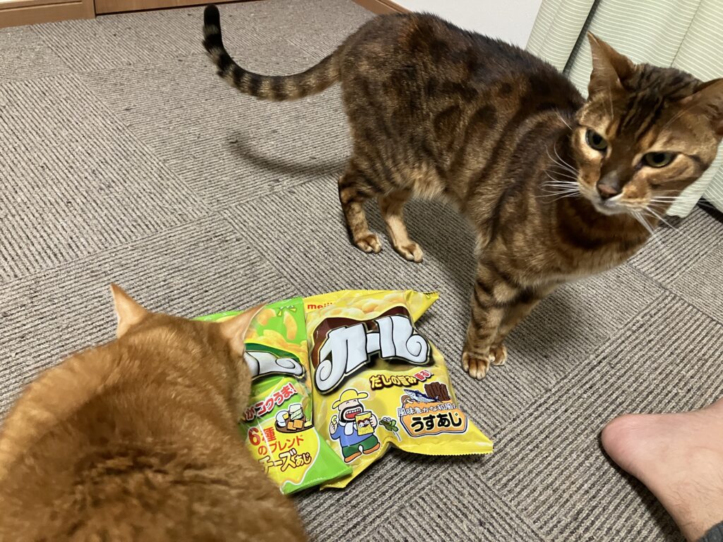 ユパは興味深々、テトはこんなの食い物でないと悟った顔をしていますが、開けたら顔を突っ込んで、1個咥えて持っていきました。(ベタベタにしただけで、半分以上残していましたが)