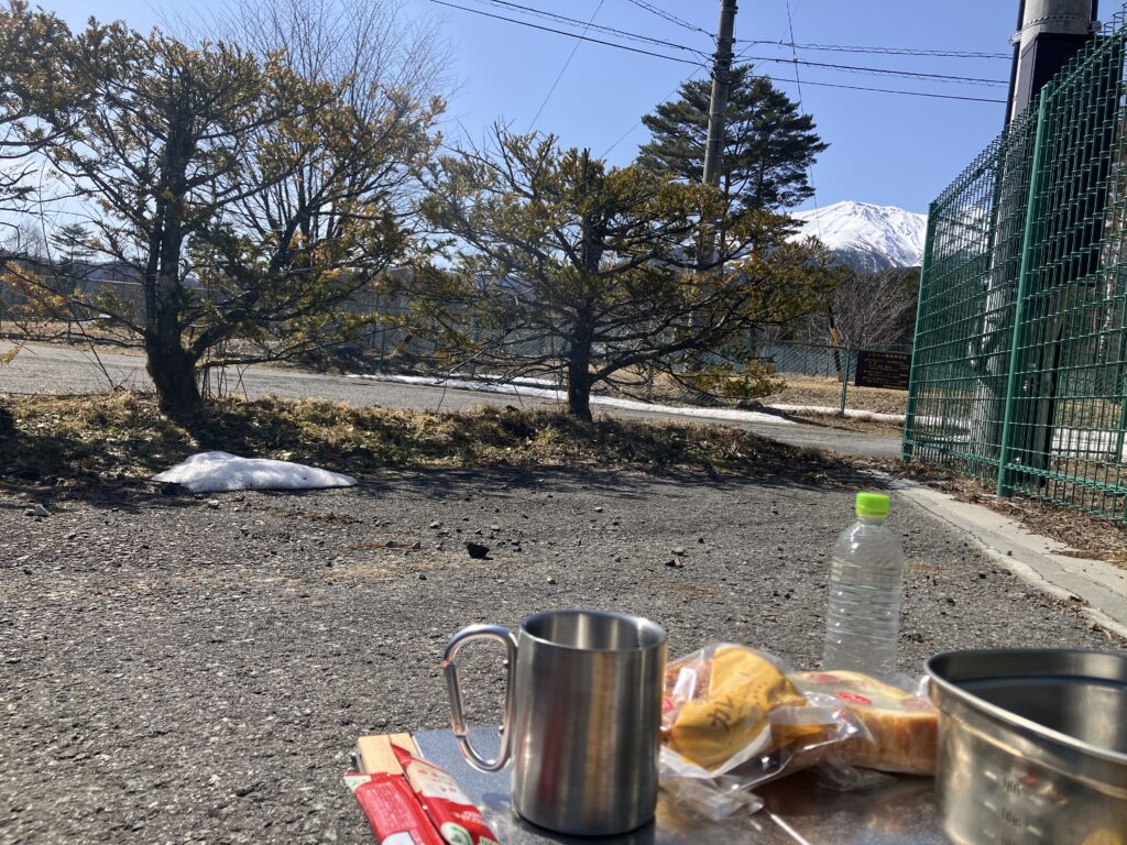とある道端で、昼ごはんタイム。昼間はポカポカ。でも、除雪してない道は、がっつり雪が残っていました。