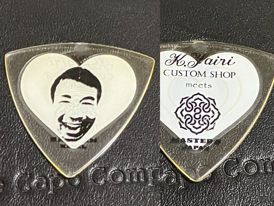 肉球ギターは、道前が作成していますが、先日フレットの調整をしてもらった際に、道前さんの顔写真付きピックを頂いています。
