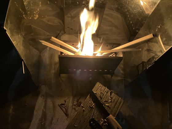 ということで、夜はそのお店で購入した焚火台ではありませんが、以前から愛用しているプチ萌ファイヤーで、プチ焚火です。