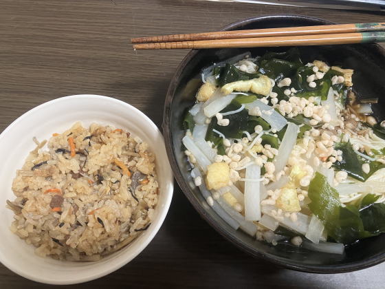 いつもは、そうめん3束のところを、1束と大根、わかめたっぷりにして、炊き込みご飯も少なめにしました。