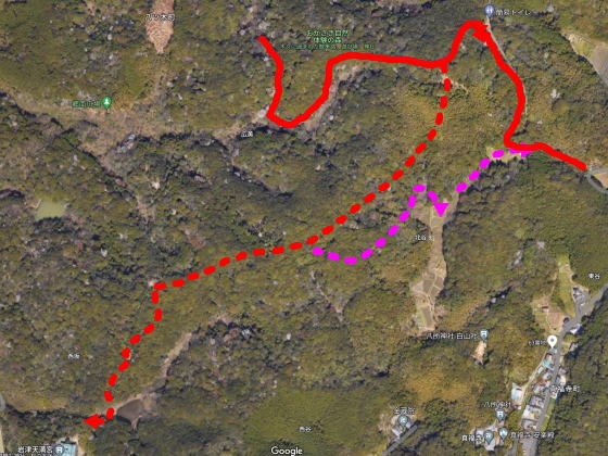 正規なDルートは赤の実線で、岩津天神さんへの行は赤の点線、帰りの遭難?エリアはたぶん紫の点線あたり。
