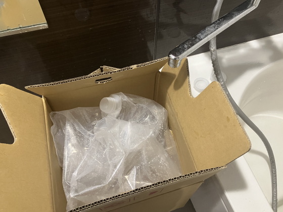 容器は、会社の仕事中に発生する20ℓキューブ容器の再利用。お風呂場ですすいで、とりあえず水入れておきました。