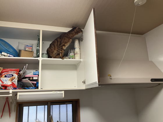 日曜日に台所の戸棚を片付けていましたが、その際に私の背中に爪を立てて飛び乗り、棚の中に入りました。