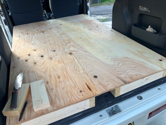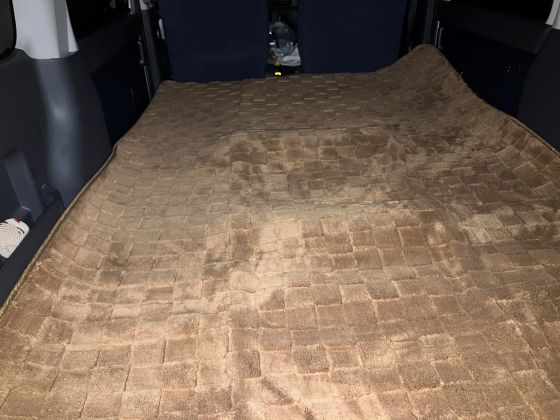 会社から帰宅すると、アマゾンで注文していたカーペットが届いていました。 早速薄暗くなった夕方に、軽バンに敷いてみましたが、 三つ折り簀巻きカーペットは真っすぐに張れない!! アマゾンで軽バンの荷台サイズより少しだけ大きい、130cm*190...